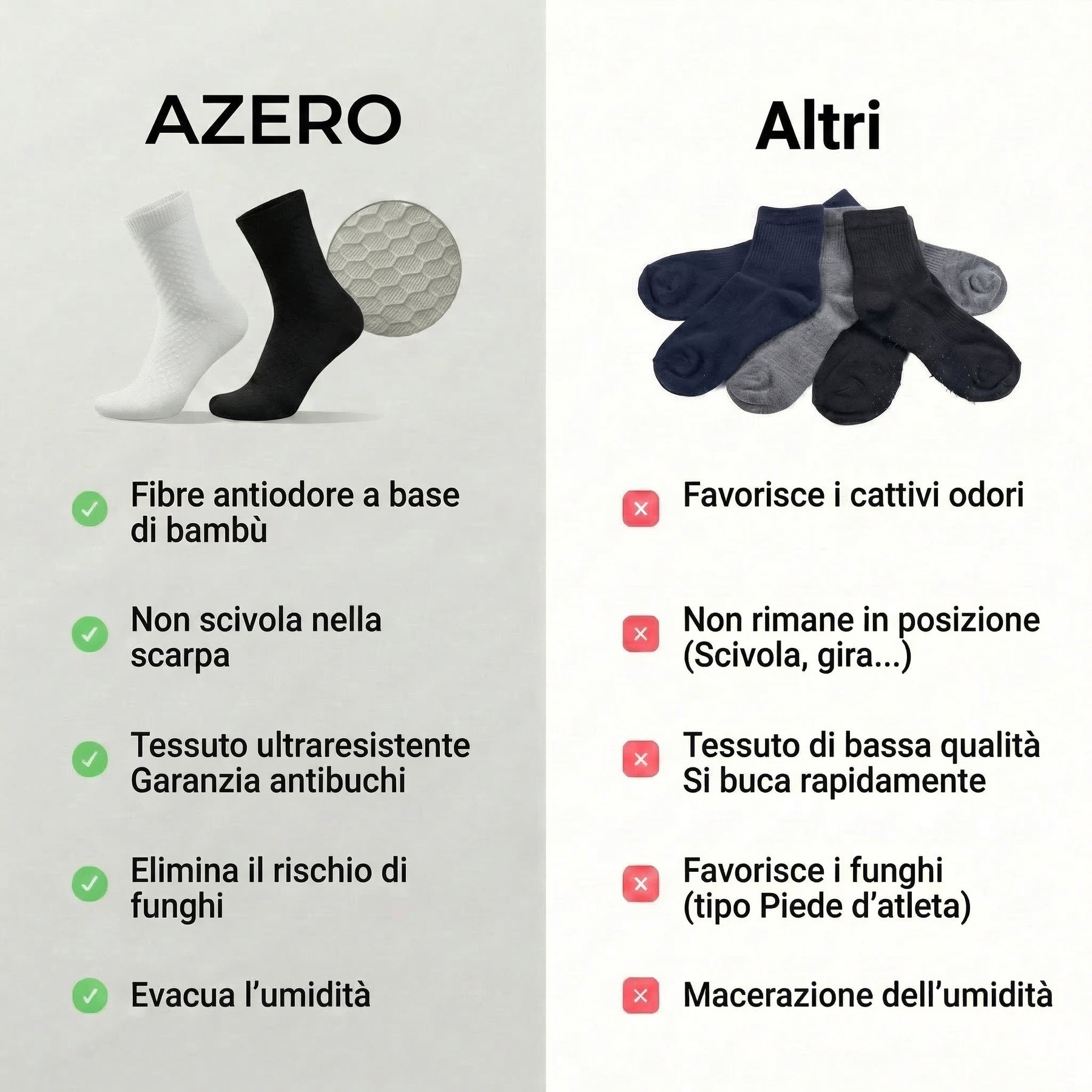 I calzini AZERO sono progettati per gestire meglio l’umidità e ridurre la sudorazione grazie a un tessuto traspirante e assorbente, mantenendo i piedi asciutti per tutto il giorno.
